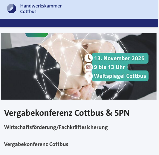 Als eine wirtschaftlich gepräge Initiative liegt uns die regionale Wirtschaft natürlich am Herzen. Auch aus diesem Grund empfehlen wir Ihnen die Vergabekonferenz der Handwerkskammer Cottbus im November 2025.